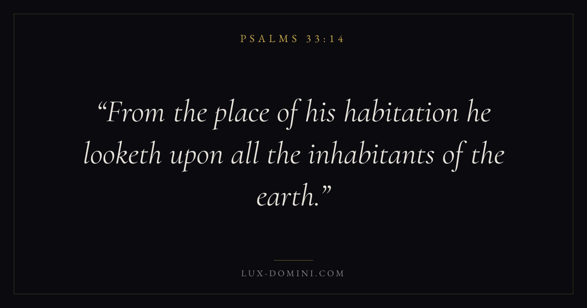 Books / Psalms / Chapter 33 / Verse 14 ← Psalms 33:13 Psalms 33:14 Psalms 33:15 → From the place of his habitation he looketh upon all the inhabitants of the earth. Download verse card Share on Twitter Share on Facebook Pin it ✦ Key themes FaithPrayerPraiseLament Read with Hebrews 11:1Romans 10:17Matthew 6:9Luke 18:1 Related topics Bible verses about faithBible verses about prayerBible verses about thankfulness and gratitudeBible verses about grief and loss ✦ Psalms Chapter 33 verses V. 1 V. 2 V. 3 V. 4 V. 5 V. 6 V. 7 V. 8 V. 9 V. 10 V. 11 V. 12 V. 13 V. 14 V. 15 V. 16 V. 17 V. 18 V. 19 V. 20 V. 21 V. 22
