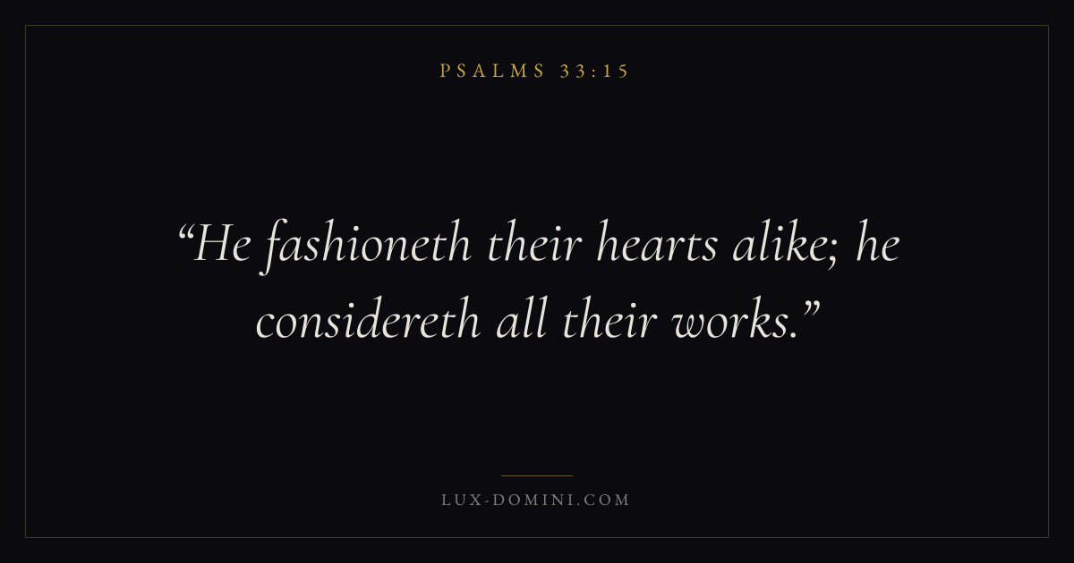 Books / Psalms / Chapter 33 / Verse 15 ← Psalms 33:14 Psalms 33:15 Psalms 33:16 → He fashioneth their hearts alike; he considereth all their works. Download verse card Share on Twitter Share on Facebook Pin it ✦ Key themes FaithPrayerPraiseLament Read with Hebrews 11:1Romans 10:17Matthew 6:9Luke 18:1 Related topics Bible verses about faithBible verses about prayerBible verses about thankfulness and gratitudeBible verses about grief and loss ✦ Psalms Chapter 33 verses V. 1 V. 2 V. 3 V. 4 V. 5 V. 6 V. 7 V. 8 V. 9 V. 10 V. 11 V. 12 V. 13 V. 14 V. 15 V. 16 V. 17 V. 18 V. 19 V. 20 V. 21 V. 22