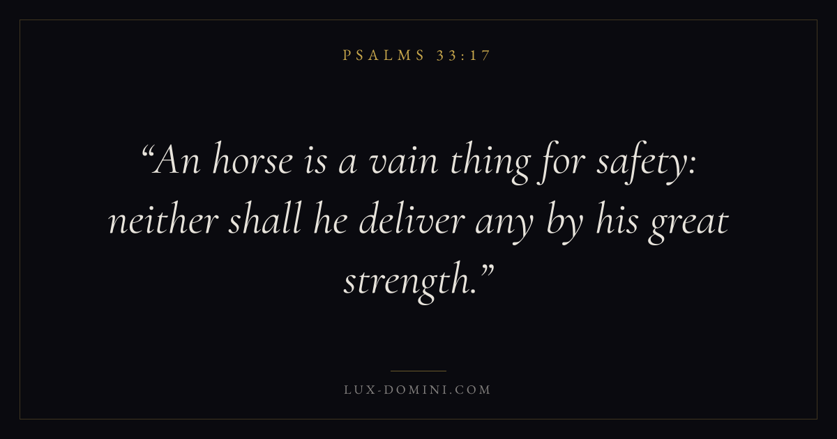 Books / Psalms / Chapter 33 / Verse 17 ← Psalms 33:16 Psalms 33:17 Psalms 33:18 → An horse is a vain thing for safety: neither shall he deliver any by his great strength. Download verse card Share on Twitter Share on Facebook Pin it ✦ Key themes FaithPrayerPraiseLament Read with Hebrews 11:1Romans 10:17Matthew 6:9Luke 18:1 Related topics Bible verses about faithBible verses about prayerBible verses about thankfulness and gratitudeBible verses about grief and loss ✦ Psalms Chapter 33 verses V. 1 V. 2 V. 3 V. 4 V. 5 V. 6 V. 7 V. 8 V. 9 V. 10 V. 11 V. 12 V. 13 V. 14 V. 15 V. 16 V. 17 V. 18 V. 19 V. 20 V. 21 V. 22