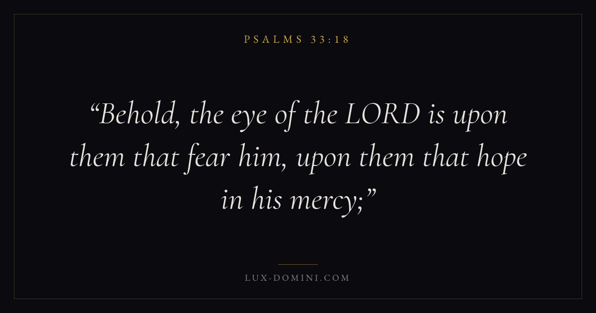 Books / Psalms / Chapter 33 / Verse 18 ← Psalms 33:17 Psalms 33:18 Psalms 33:19 → Behold, the eye of the LORD is upon them that fear him, upon them that hope in his mercy; Download verse card Share on Twitter Share on Facebook Pin it ✦ Key themes FaithHopeAnxiety and fearPrayerPraise Read with Hebrews 11:1Romans 10:17Romans 8:24Revelation 21:4 Related topics Bible verses about faithBible verses about hopeBible verses about anxiety and fearBible verses about prayerBible verses about thankfulness and gratitude ✦ Psalms Chapter 33 verses V. 1 V. 2 V. 3 V. 4 V. 5 V. 6 V. 7 V. 8 V. 9 V. 10 V. 11 V. 12 V. 13 V. 14 V. 15 V. 16 V. 17 V. 18 V. 19 V. 20 V. 21 V. 22
