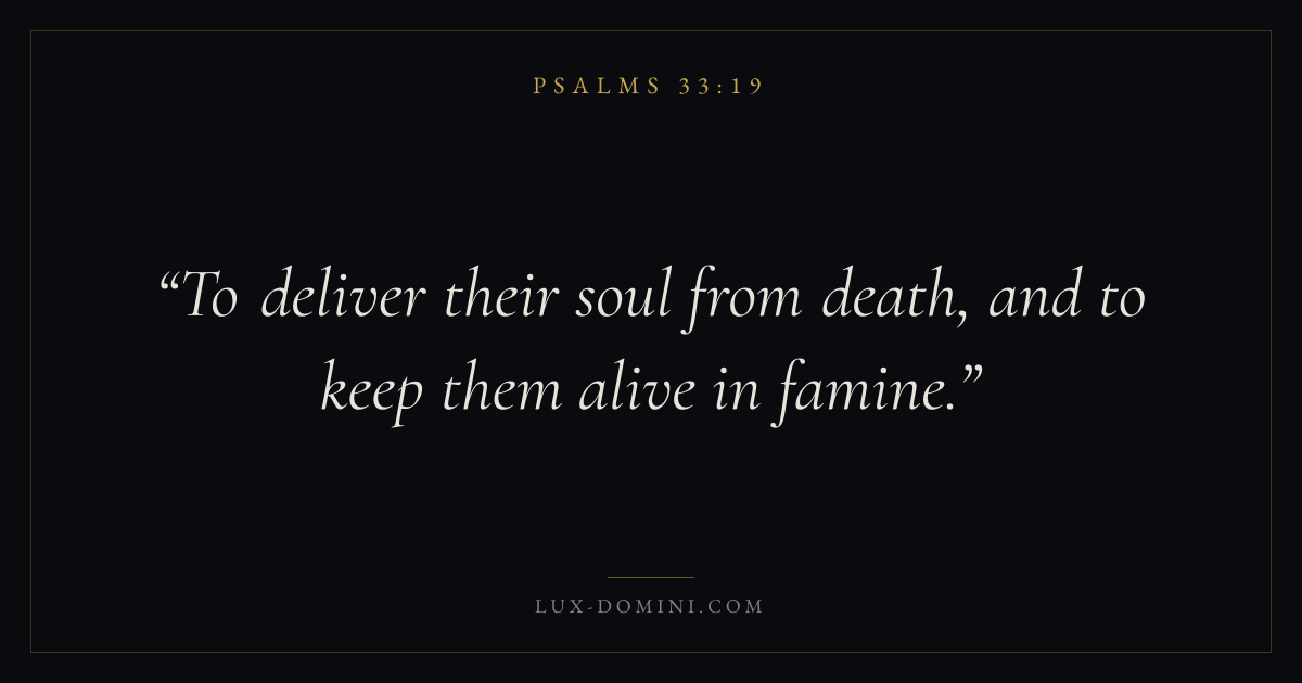 Books / Psalms / Chapter 33 / Verse 19 ← Psalms 33:18 Psalms 33:19 Psalms 33:20 → To deliver their soul from death, and to keep them alive in famine. Download verse card Share on Twitter Share on Facebook Pin it ✦ Key themes FaithPrayerPraiseLament Read with Hebrews 11:1Romans 10:17Matthew 6:9Luke 18:1 Related topics Bible verses about faithBible verses about prayerBible verses about thankfulness and gratitudeBible verses about grief and loss ✦ Psalms Chapter 33 verses V. 1 V. 2 V. 3 V. 4 V. 5 V. 6 V. 7 V. 8 V. 9 V. 10 V. 11 V. 12 V. 13 V. 14 V. 15 V. 16 V. 17 V. 18 V. 19 V. 20 V. 21 V. 22