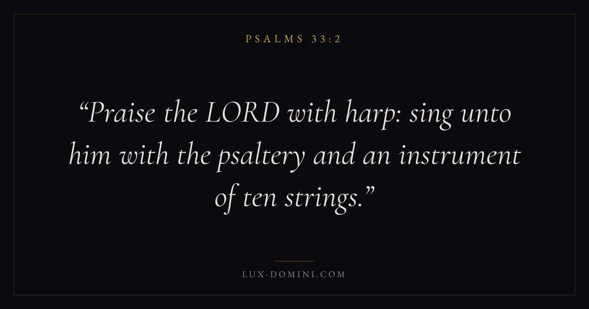 Books / Psalms / Chapter 33 / Verse 2 ← Psalms 33:1 Psalms 33:2 Psalms 33:3 → Praise the LORD with harp: sing unto him with the psaltery and an instrument of ten strings. Download verse card Share on Twitter Share on Facebook Pin it ✦ Key themes FaithPrayerPraiseLament Read with Hebrews 11:1Romans 10:17Matthew 6:9Luke 18:1 Related topics Bible verses about faithBible verses about prayerBible verses about thankfulness and gratitudeBible verses about grief and loss ✦ Psalms Chapter 33 verses V. 1 V. 2 V. 3 V. 4 V. 5 V. 6 V. 7 V. 8 V. 9 V. 10 V. 11 V. 12 V. 13 V. 14 V. 15 V. 16 V. 17 V. 18 V. 19 V. 20 V. 21 V. 22