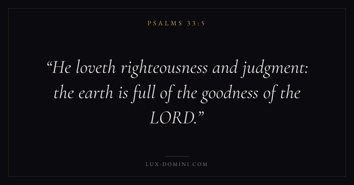 Books / Psalms / Chapter 33 / Verse 5 ← Psalms 33:4 Psalms 33:5 Psalms 33:6 → He loveth righteousness and judgment: the earth is full of the goodness of the LORD. Download verse card Share on Twitter Share on Facebook Pin it ✦ Key themes LoveFaithPrayerJustice and mercyPraise Read with John 3:161 Corinthians 13:4Hebrews 11:1Romans 10:17 Related topics Bible verses about loveBible verses about faithBible verses about prayerBible verses about justice and mercyBible verses about thankfulness and gratitude ✦ Psalms Chapter 33 verses V. 1 V. 2 V. 3 V. 4 V. 5 V. 6 V. 7 V. 8 V. 9 V. 10 V. 11 V. 12 V. 13 V. 14 V. 15 V. 16 V. 17 V. 18 V. 19 V. 20 V. 21 V. 22