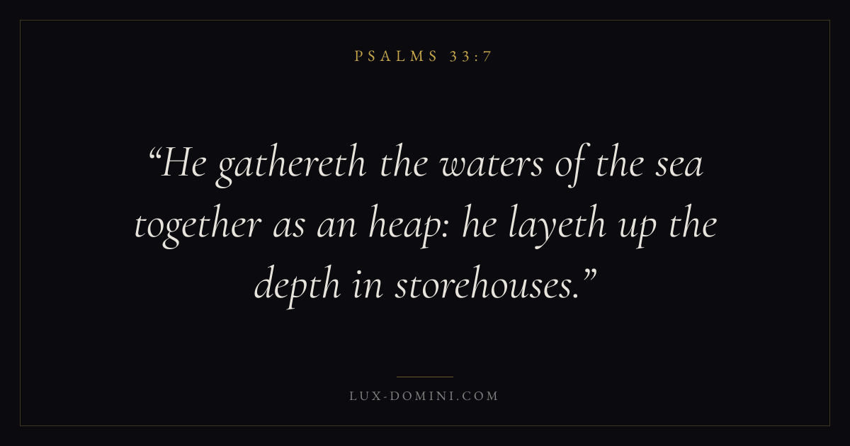 Books / Psalms / Chapter 33 / Verse 7 ← Psalms 33:6 Psalms 33:7 Psalms 33:8 → He gathereth the waters of the sea together as an heap: he layeth up the depth in storehouses. Download verse card Share on Twitter Share on Facebook Pin it ✦ Key themes FaithPrayerPraiseLament Read with Hebrews 11:1Romans 10:17Matthew 6:9Luke 18:1 Related topics Bible verses about faithBible verses about prayerBible verses about thankfulness and gratitudeBible verses about grief and loss ✦ Psalms Chapter 33 verses V. 1 V. 2 V. 3 V. 4 V. 5 V. 6 V. 7 V. 8 V. 9 V. 10 V. 11 V. 12 V. 13 V. 14 V. 15 V. 16 V. 17 V. 18 V. 19 V. 20 V. 21 V. 22