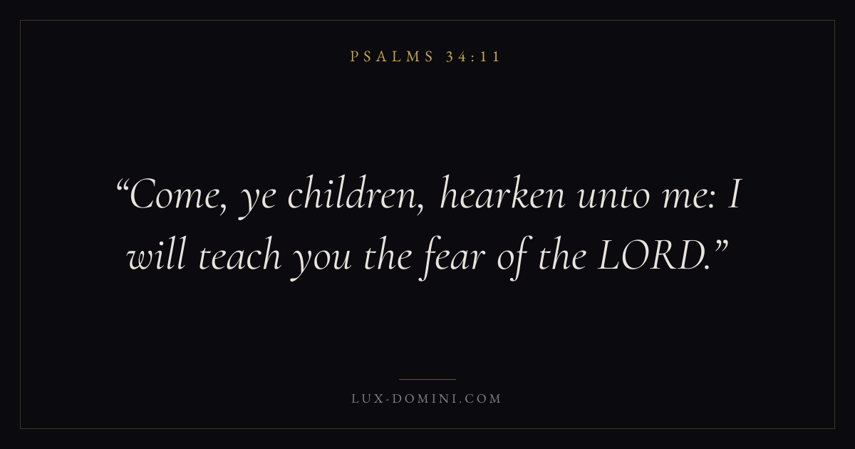 Books / Psalms / Chapter 34 / Verse 11 ← Psalms 34:10 Psalms 34:11 Psalms 34:12 → Come, ye children, hearken unto me: I will teach you the fear of the LORD. Download verse card Share on Twitter Share on Facebook Pin it ✦ Key themes FaithAnxiety and fearPrayerTruthPraise Read with Hebrews 11:1Romans 10:17Philippians 4:6Isaiah 41:10 Related topics Bible verses about faithBible verses about anxiety and fearBible verses about prayerBible verses about truthBible verses about thankfulness and gratitude ✦ Psalms Chapter 34 verses V. 1 V. 2 V. 3 V. 4 V. 5 V. 6 V. 7 V. 8 V. 9 V. 10 V. 11 V. 12 V. 13 V. 14 V. 15 V. 16 V. 17 V. 18 V. 19 V. 20 V. 21 V. 22