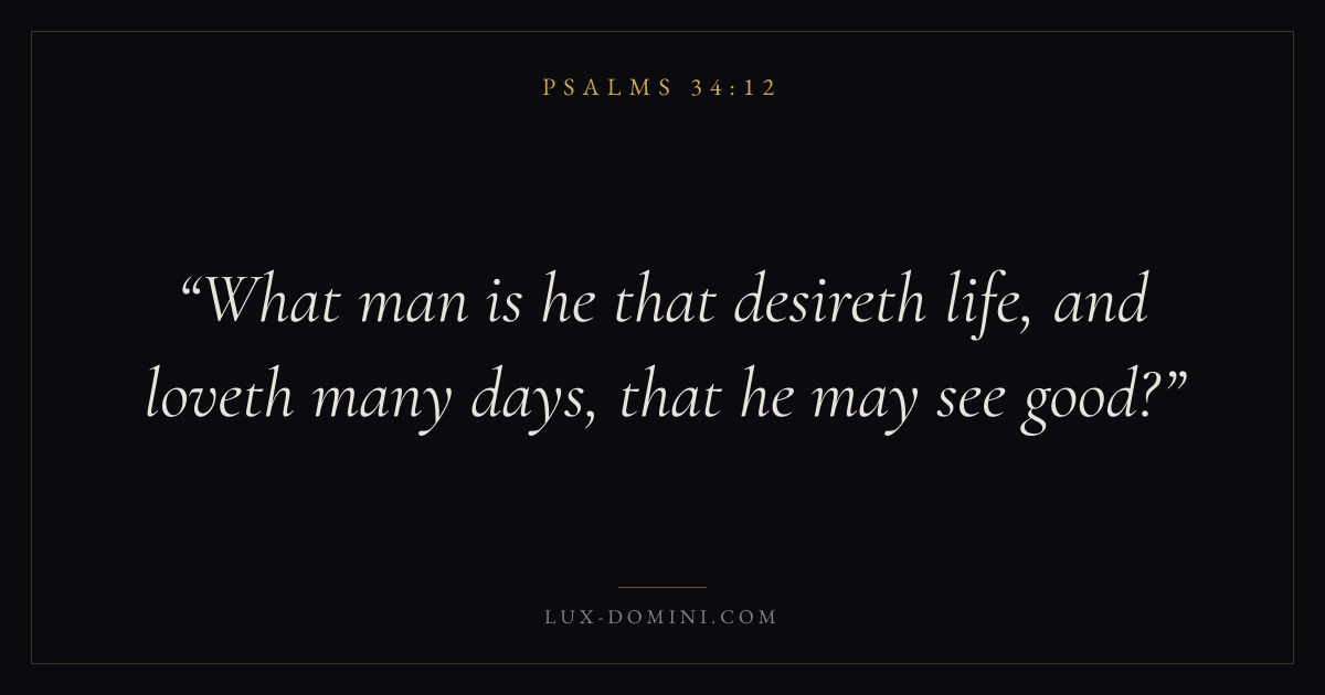 Books / Psalms / Chapter 34 / Verse 12 ← Psalms 34:11 Psalms 34:12 Psalms 34:13 → What man is he that desireth life, and loveth many days, that he may see good? Download verse card Share on Twitter Share on Facebook Pin it ✦ Key themes LoveFaithAnxiety and fearPrayerPraise Read with John 3:161 Corinthians 13:4Hebrews 11:1Romans 10:17 Related topics Bible verses about loveBible verses about faithBible verses about anxiety and fearBible verses about prayerBible verses about thankfulness and gratitude ✦ Psalms Chapter 34 verses V. 1 V. 2 V. 3 V. 4 V. 5 V. 6 V. 7 V. 8 V. 9 V. 10 V. 11 V. 12 V. 13 V. 14 V. 15 V. 16 V. 17 V. 18 V. 19 V. 20 V. 21 V. 22