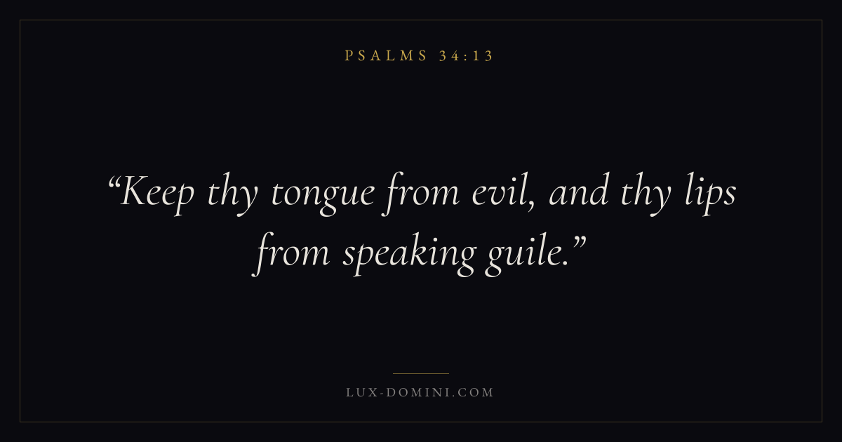 Books / Psalms / Chapter 34 / Verse 13 ← Psalms 34:12 Psalms 34:13 Psalms 34:14 → Keep thy tongue from evil, and thy lips from speaking guile. Download verse card Share on Twitter Share on Facebook Pin it ✦ Key themes FaithAnxiety and fearPrayerTruthPraise Read with Hebrews 11:1Romans 10:17Philippians 4:6Isaiah 41:10 Related topics Bible verses about faithBible verses about anxiety and fearBible verses about prayerBible verses about truthBible verses about thankfulness and gratitude ✦ Psalms Chapter 34 verses V. 1 V. 2 V. 3 V. 4 V. 5 V. 6 V. 7 V. 8 V. 9 V. 10 V. 11 V. 12 V. 13 V. 14 V. 15 V. 16 V. 17 V. 18 V. 19 V. 20 V. 21 V. 22