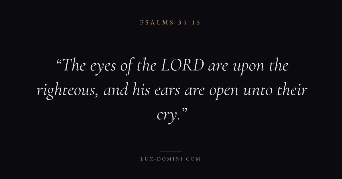 Books / Psalms / Chapter 34 / Verse 15 ← Psalms 34:14 Psalms 34:15 Psalms 34:16 → The eyes of the LORD are upon the righteous, and his ears are open unto their cry. Download verse card Share on Twitter Share on Facebook Pin it ✦ Key themes FaithAnxiety and fearPrayerTruthPraise Read with Hebrews 11:1Romans 10:17Philippians 4:6Isaiah 41:10 Related topics Bible verses about faithBible verses about anxiety and fearBible verses about prayerBible verses about truthBible verses about thankfulness and gratitude ✦ Psalms Chapter 34 verses V. 1 V. 2 V. 3 V. 4 V. 5 V. 6 V. 7 V. 8 V. 9 V. 10 V. 11 V. 12 V. 13 V. 14 V. 15 V. 16 V. 17 V. 18 V. 19 V. 20 V. 21 V. 22