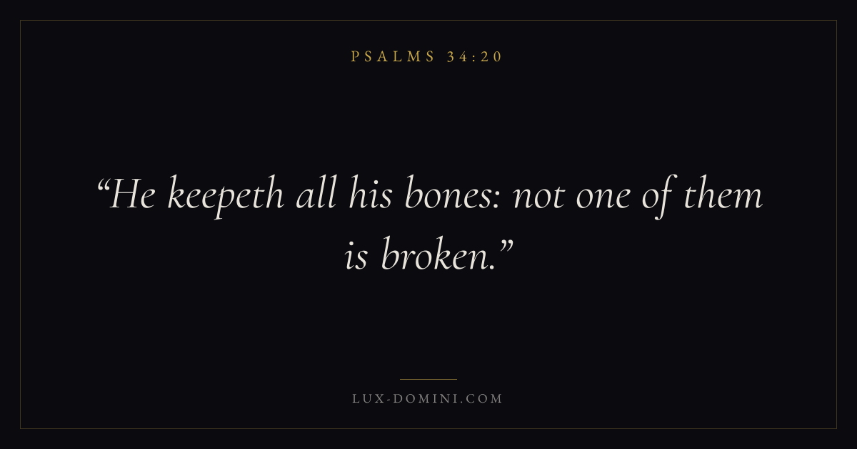 Books / Psalms / Chapter 34 / Verse 20 ← Psalms 34:19 Psalms 34:20 Psalms 34:21 → He keepeth all his bones: not one of them is broken. Download verse card Share on Twitter Share on Facebook Pin it ✦ Key themes FaithAnxiety and fearPrayerTruthPraise Read with Hebrews 11:1Romans 10:17Philippians 4:6Isaiah 41:10 Related topics Bible verses about faithBible verses about anxiety and fearBible verses about prayerBible verses about truthBible verses about thankfulness and gratitude ✦ Psalms Chapter 34 verses V. 1 V. 2 V. 3 V. 4 V. 5 V. 6 V. 7 V. 8 V. 9 V. 10 V. 11 V. 12 V. 13 V. 14 V. 15 V. 16 V. 17 V. 18 V. 19 V. 20 V. 21 V. 22