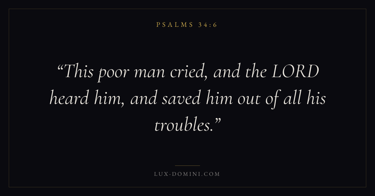 Books / Psalms / Chapter 34 / Verse 6 ← Psalms 34:5 Psalms 34:6 Psalms 34:7 → This poor man cried, and the LORD heard him, and saved him out of all his troubles. Download verse card Share on Twitter Share on Facebook Pin it ✦ Key themes FaithHopePrayerJustice and mercyPraise Read with Hebrews 11:1Romans 10:17Romans 8:24Revelation 21:4 Related topics Bible verses about faithBible verses about hopeBible verses about prayerBible verses about justice and mercyBible verses about thankfulness and gratitude ✦ Psalms Chapter 34 verses V. 1 V. 2 V. 3 V. 4 V. 5 V. 6 V. 7 V. 8 V. 9 V. 10 V. 11 V. 12 V. 13 V. 14 V. 15 V. 16 V. 17 V. 18 V. 19 V. 20 V. 21 V. 22