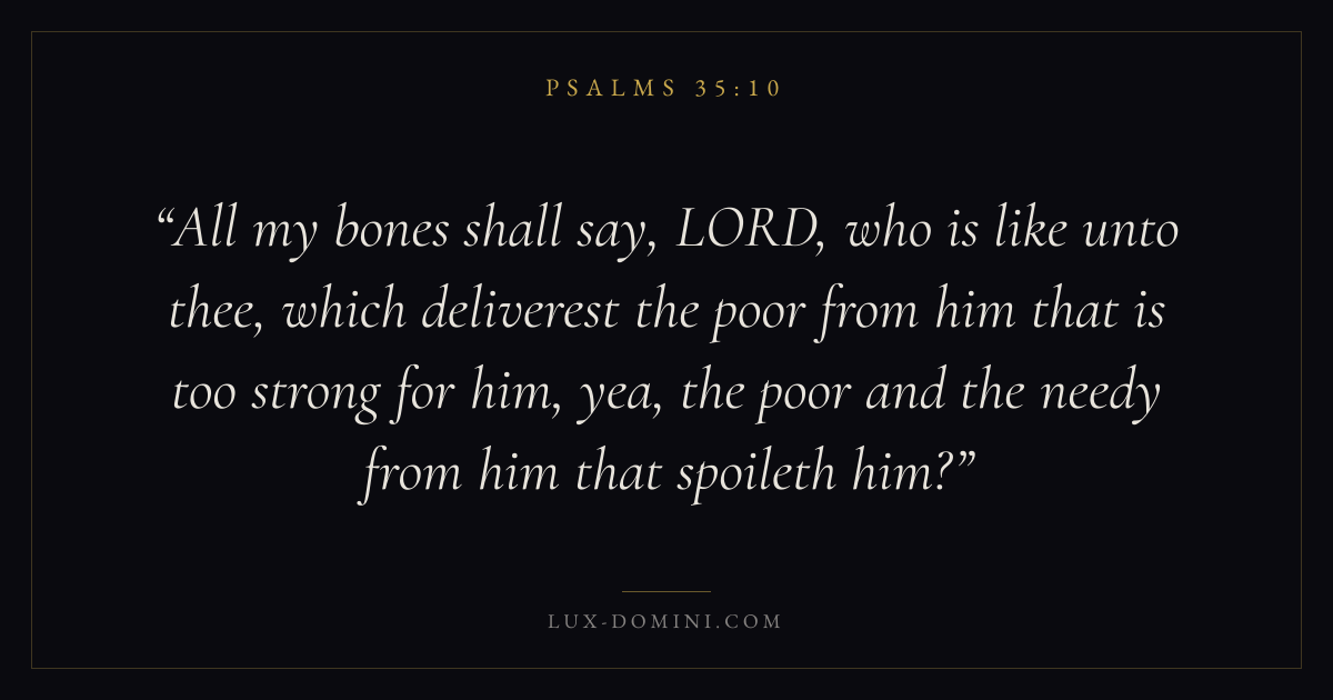All my bones shall say, LORD, who is like unto thee, which deliverest the poor from him that is too strong for him, yea, the poor and the needy from him that spoileth him?
