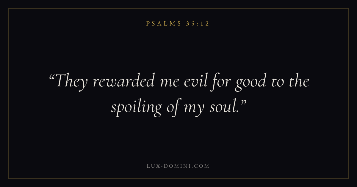 Books / Psalms / Chapter 35 / Verse 12 ← Psalms 35:11 Psalms 35:12 Psalms 35:13 → They rewarded me evil for good to the spoiling of my soul. Download verse card Share on Twitter Share on Facebook Pin it ✦ Key themes FaithPrayerPraiseLament Read with Hebrews 11:1Romans 10:17Matthew 6:9Luke 18:1 Related topics Bible verses about faithBible verses about prayerBible verses about thankfulness and gratitudeBible verses about grief and loss ✦ Psalms Chapter 35 verses V. 1 V. 2 V. 3 V. 4 V. 5 V. 6 V. 7 V. 8 V. 9 V. 10 V. 11 V. 12 V. 13 V. 14 V. 15 V. 16 V. 17 V. 18 V. 19 V. 20 V. 21 V. 22 V. 23 V. 24 V. 25 V. 26 V. 27 V. 28