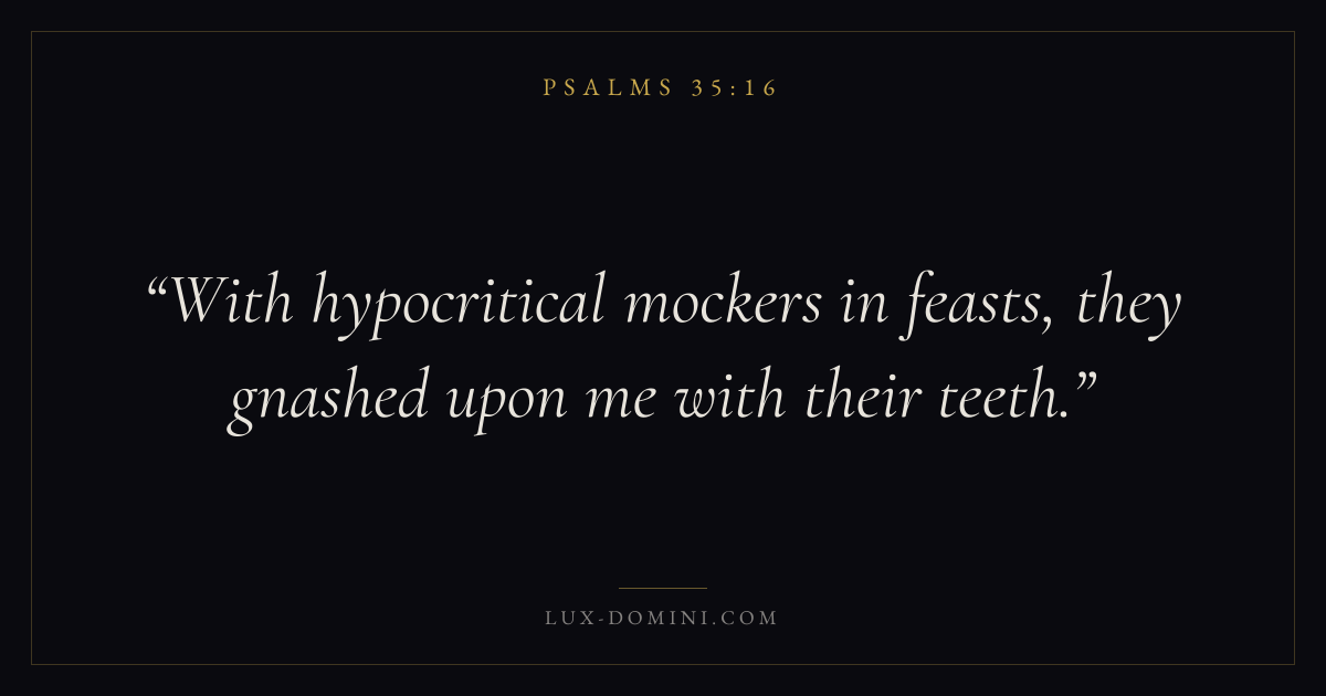 Books / Psalms / Chapter 35 / Verse 16 ← Psalms 35:15 Psalms 35:16 Psalms 35:17 → With hypocritical mockers in feasts, they gnashed upon me with their teeth. Download verse card Share on Twitter Share on Facebook Pin it ✦ Key themes FaithPrayerPraiseLament Read with Hebrews 11:1Romans 10:17Matthew 6:9Luke 18:1 Related topics Bible verses about faithBible verses about prayerBible verses about thankfulness and gratitudeBible verses about grief and loss ✦ Psalms Chapter 35 verses V. 1 V. 2 V. 3 V. 4 V. 5 V. 6 V. 7 V. 8 V. 9 V. 10 V. 11 V. 12 V. 13 V. 14 V. 15 V. 16 V. 17 V. 18 V. 19 V. 20 V. 21 V. 22 V. 23 V. 24 V. 25 V. 26 V. 27 V. 28