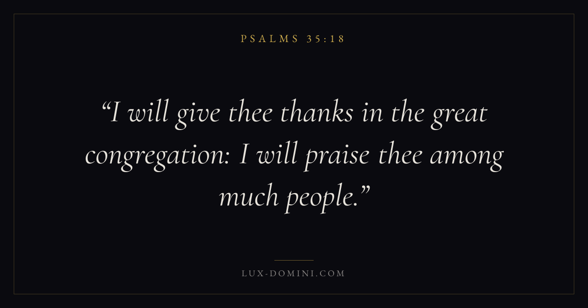 Books / Psalms / Chapter 35 / Verse 18 ← Psalms 35:17 Psalms 35:18 Psalms 35:19 → I will give thee thanks in the great congregation: I will praise thee among much people. Download verse card Share on Twitter Share on Facebook Pin it ✦ Key themes FaithPrayerSalvationPraise Read with Hebrews 11:1Romans 10:17Matthew 6:9Luke 18:1 Related topics Bible verses about faithBible verses about prayerBible verses about salvationBible verses about thankfulness and gratitude ✦ Psalms Chapter 35 verses V. 1 V. 2 V. 3 V. 4 V. 5 V. 6 V. 7 V. 8 V. 9 V. 10 V. 11 V. 12 V. 13 V. 14 V. 15 V. 16 V. 17 V. 18 V. 19 V. 20 V. 21 V. 22 V. 23 V. 24 V. 25 V. 26 V. 27 V. 28