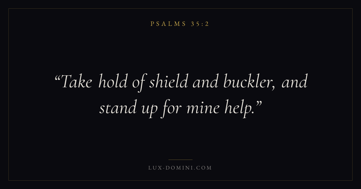 Books / Psalms / Chapter 35 / Verse 2 ← Psalms 35:1 Psalms 35:2 Psalms 35:3 → Take hold of shield and buckler, and stand up for mine help. Download verse card Share on Twitter Share on Facebook Pin it ✦ Key themes FaithPrayerPraiseLament Read with Hebrews 11:1Romans 10:17Matthew 6:9Luke 18:1 Related topics Bible verses about faithBible verses about prayerBible verses about thankfulness and gratitudeBible verses about grief and loss ✦ Psalms Chapter 35 verses V. 1 V. 2 V. 3 V. 4 V. 5 V. 6 V. 7 V. 8 V. 9 V. 10 V. 11 V. 12 V. 13 V. 14 V. 15 V. 16 V. 17 V. 18 V. 19 V. 20 V. 21 V. 22 V. 23 V. 24 V. 25 V. 26 V. 27 V. 28