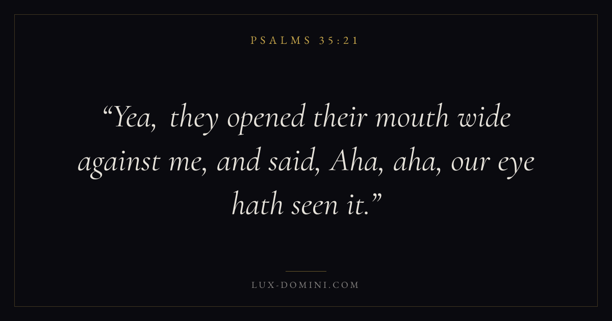 Books / Psalms / Chapter 35 / Verse 21 ← Psalms 35:20 Psalms 35:21 Psalms 35:22 → Yea, they opened their mouth wide against me, and said, Aha, aha, our eye hath seen it. Download verse card Share on Twitter Share on Facebook Pin it ✦ Key themes FaithPrayerSalvationPraise Read with Hebrews 11:1Romans 10:17Matthew 6:9Luke 18:1 Related topics Bible verses about faithBible verses about prayerBible verses about salvationBible verses about thankfulness and gratitude ✦ Psalms Chapter 35 verses V. 1 V. 2 V. 3 V. 4 V. 5 V. 6 V. 7 V. 8 V. 9 V. 10 V. 11 V. 12 V. 13 V. 14 V. 15 V. 16 V. 17 V. 18 V. 19 V. 20 V. 21 V. 22 V. 23 V. 24 V. 25 V. 26 V. 27 V. 28
