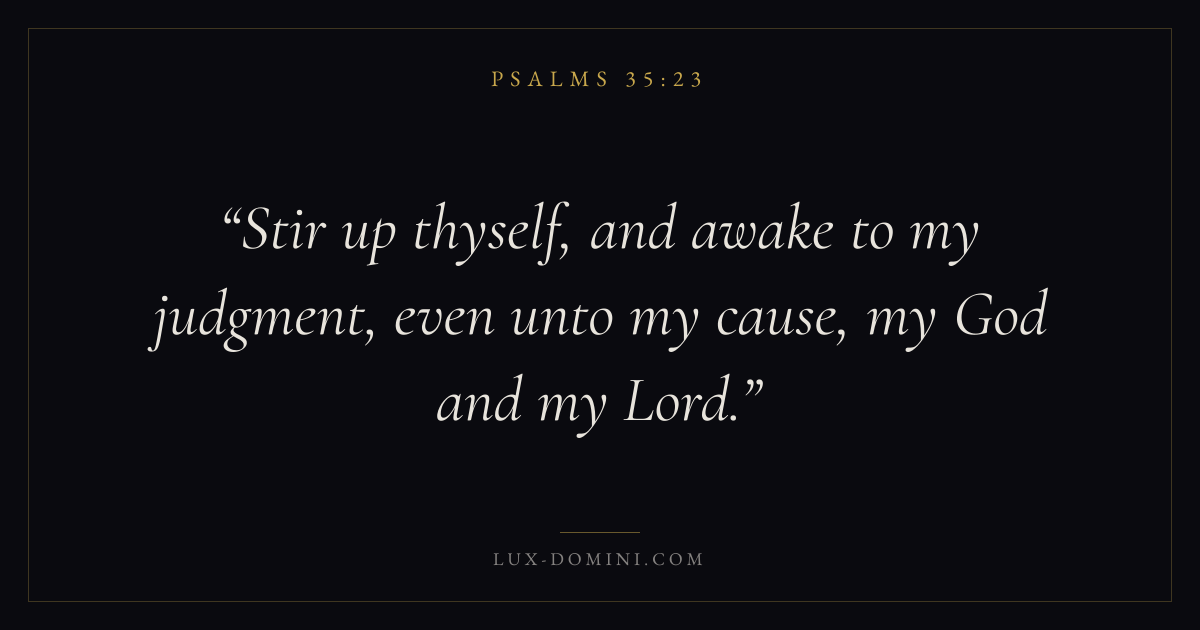 Books / Psalms / Chapter 35 / Verse 23 ← Psalms 35:22 Psalms 35:23 Psalms 35:24 → Stir up thyself, and awake to my judgment, even unto my cause, my God and my Lord. Download verse card Share on Twitter Share on Facebook Pin it ✦ Key themes FaithPrayerJustice and mercySalvationPraise Read with Hebrews 11:1Romans 10:17Matthew 6:9Luke 18:1 Related topics Bible verses about faithBible verses about prayerBible verses about justice and mercyBible verses about salvationBible verses about thankfulness and gratitude ✦ Psalms Chapter 35 verses V. 1 V. 2 V. 3 V. 4 V. 5 V. 6 V. 7 V. 8 V. 9 V. 10 V. 11 V. 12 V. 13 V. 14 V. 15 V. 16 V. 17 V. 18 V. 19 V. 20 V. 21 V. 22 V. 23 V. 24 V. 25 V. 26 V. 27 V. 28