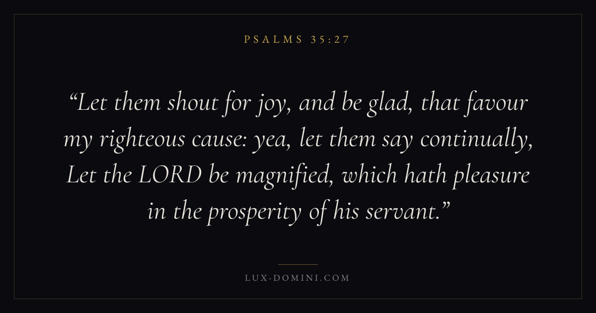 Let them shout for joy, and be glad, that favour my righteous cause: yea, let them say continually, Let the LORD be magnified, which hath pleasure in the prosperity of his servant.