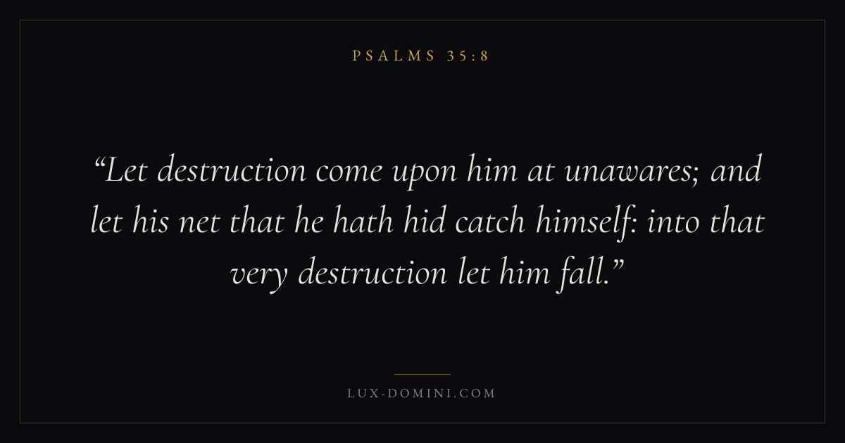Let destruction come upon him at unawares; and let his net that he hath hid catch himself: into that very destruction let him fall.