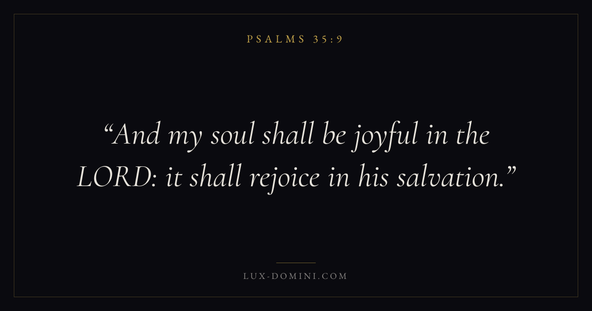 Books / Psalms / Chapter 35 / Verse 9 ← Psalms 35:8 Psalms 35:9 Psalms 35:10 → And my soul shall be joyful in the LORD: it shall rejoice in his salvation. Download verse card Share on Twitter Share on Facebook Pin it ✦ Key themes FaithPrayerSalvationPraise Read with Hebrews 11:1Romans 10:17Matthew 6:9Luke 18:1 Related topics Bible verses about faithBible verses about prayerBible verses about salvationBible verses about thankfulness and gratitude ✦ Psalms Chapter 35 verses V. 1 V. 2 V. 3 V. 4 V. 5 V. 6 V. 7 V. 8 V. 9 V. 10 V. 11 V. 12 V. 13 V. 14 V. 15 V. 16 V. 17 V. 18 V. 19 V. 20 V. 21 V. 22 V. 23 V. 24 V. 25 V. 26 V. 27 V. 28
