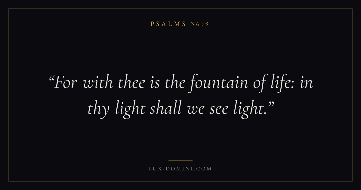 Books / Psalms / Chapter 36 / Verse 9 ← Psalms 36:8 Psalms 36:9 Psalms 36:10 → For with thee is the fountain of life: in thy light shall we see light. Download verse card Share on Twitter Share on Facebook Pin it ✦ Key themes FaithPrayerJustice and mercyPraise Read with Hebrews 11:1Romans 10:17Matthew 6:9Luke 18:1 Related topics Bible verses about faithBible verses about prayerBible verses about justice and mercyBible verses about thankfulness and gratitude ✦ Psalms Chapter 36 verses V. 1 V. 2 V. 3 V. 4 V. 5 V. 6 V. 7 V. 8 V. 9 V. 10 V. 11 V. 12