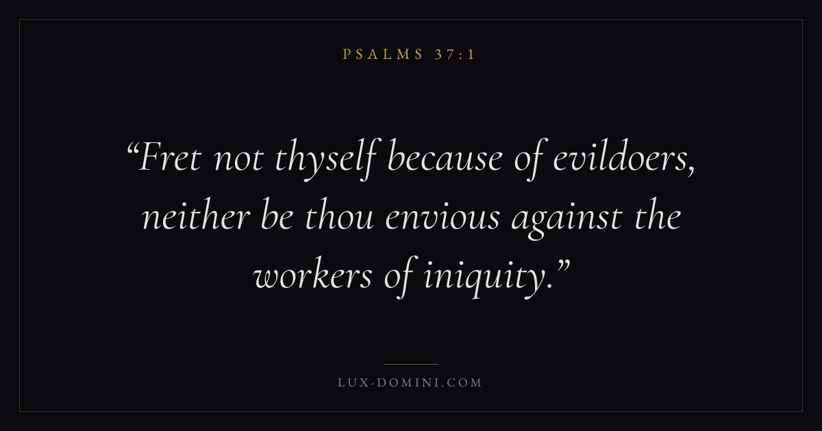 Books / Psalms / Chapter 37 / Verse 1 ← Psalms 36:12 Psalms 37:1 Psalms 37:2 → Fret not thyself because of evildoers, neither be thou envious against the workers of iniquity. Download verse card Share on Twitter Share on Facebook Pin it ✦ Key themes FaithPrayerPraiseLament Read with Hebrews 11:1Romans 10:17Matthew 6:9Luke 18:1 Related topics Bible verses about faithBible verses about prayerBible verses about thankfulness and gratitudeBible verses about grief and loss ✦ Psalms Chapter 37 verses V. 1 V. 2 V. 3 V. 4 V. 5 V. 6 V. 7 V. 8 V. 9 V. 10 V. 11 V. 12 V. 13 V. 14 V. 15 V. 16 V. 17 V. 18 V. 19 V. 20 V. 21 V. 22 V. 23 V. 24 V. 25 V. 26 V. 27 V. 28 V. 29 V. 30 V. 31 V. 32 V. 33 V. 34 V. 35 V. 36 V. 37 V. 38 V. 39 V. 40