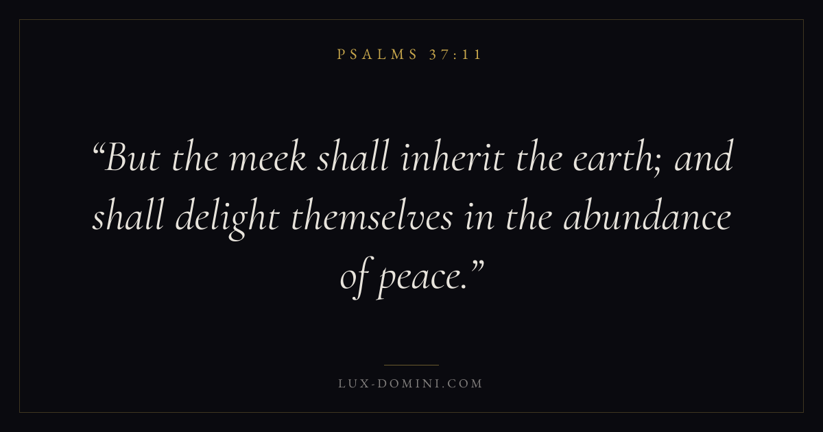 Books / Psalms / Chapter 37 / Verse 11 ← Psalms 37:10 Psalms 37:11 Psalms 37:12 → But the meek shall inherit the earth; and shall delight themselves in the abundance of peace. Download verse card Share on Twitter Share on Facebook Pin it ✦ Key themes FaithPrayerPeaceHumilityPraise Read with Hebrews 11:1Romans 10:17Matthew 6:9Luke 18:1 Related topics Bible verses about faithBible verses about prayerBible verses about peaceBible verses about humilityBible verses about thankfulness and gratitude ✦ Psalms Chapter 37 verses V. 1 V. 2 V. 3 V. 4 V. 5 V. 6 V. 7 V. 8 V. 9 V. 10 V. 11 V. 12 V. 13 V. 14 V. 15 V. 16 V. 17 V. 18 V. 19 V. 20 V. 21 V. 22 V. 23 V. 24 V. 25 V. 26 V. 27 V. 28 V. 29 V. 30 V. 31 V. 32 V. 33 V. 34 V. 35 V. 36 V. 37 V. 38 V. 39 V. 40