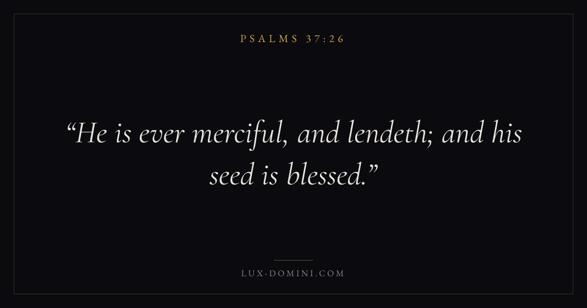 Books / Psalms / Chapter 37 / Verse 26 ← Psalms 37:25 Psalms 37:26 Psalms 37:27 → He is ever merciful, and lendeth; and his seed is blessed. Download verse card Share on Twitter Share on Facebook Pin it ✦ Key themes FaithPrayerJustice and mercyPraise Read with Hebrews 11:1Romans 10:17Matthew 6:9Luke 18:1 Related topics Bible verses about faithBible verses about prayerBible verses about justice and mercyBible verses about thankfulness and gratitude ✦ Psalms Chapter 37 verses V. 1 V. 2 V. 3 V. 4 V. 5 V. 6 V. 7 V. 8 V. 9 V. 10 V. 11 V. 12 V. 13 V. 14 V. 15 V. 16 V. 17 V. 18 V. 19 V. 20 V. 21 V. 22 V. 23 V. 24 V. 25 V. 26 V. 27 V. 28 V. 29 V. 30 V. 31 V. 32 V. 33 V. 34 V. 35 V. 36 V. 37 V. 38 V. 39 V. 40