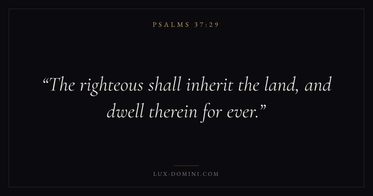 Books / Psalms / Chapter 37 / Verse 29 ← Psalms 37:28 Psalms 37:29 Psalms 37:30 → The righteous shall inherit the land, and dwell therein for ever. Download verse card Share on Twitter Share on Facebook Pin it ✦ Key themes FaithPrayerPraiseLament Read with Hebrews 11:1Romans 10:17Matthew 6:9Luke 18:1 Related topics Bible verses about faithBible verses about prayerBible verses about thankfulness and gratitudeBible verses about grief and loss ✦ Psalms Chapter 37 verses V. 1 V. 2 V. 3 V. 4 V. 5 V. 6 V. 7 V. 8 V. 9 V. 10 V. 11 V. 12 V. 13 V. 14 V. 15 V. 16 V. 17 V. 18 V. 19 V. 20 V. 21 V. 22 V. 23 V. 24 V. 25 V. 26 V. 27 V. 28 V. 29 V. 30 V. 31 V. 32 V. 33 V. 34 V. 35 V. 36 V. 37 V. 38 V. 39 V. 40