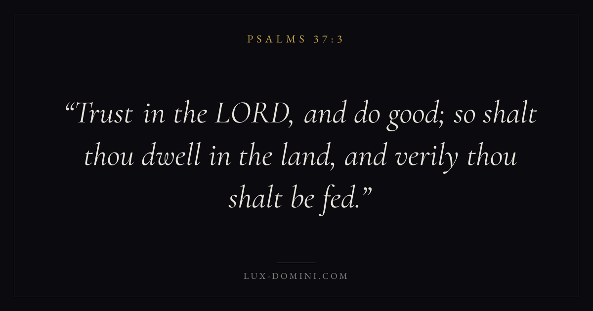 Books / Psalms / Chapter 37 / Verse 3 ← Psalms 37:2 Psalms 37:3 Psalms 37:4 → Trust in the LORD, and do good; so shalt thou dwell in the land, and verily thou shalt be fed. Download verse card Share on Twitter Share on Facebook Pin it ✦ Key themes FaithPrayerPraiseLament Read with Hebrews 11:1Romans 10:17Matthew 6:9Luke 18:1 Related topics Bible verses about faithBible verses about prayerBible verses about thankfulness and gratitudeBible verses about grief and loss ✦ Psalms Chapter 37 verses V. 1 V. 2 V. 3 V. 4 V. 5 V. 6 V. 7 V. 8 V. 9 V. 10 V. 11 V. 12 V. 13 V. 14 V. 15 V. 16 V. 17 V. 18 V. 19 V. 20 V. 21 V. 22 V. 23 V. 24 V. 25 V. 26 V. 27 V. 28 V. 29 V. 30 V. 31 V. 32 V. 33 V. 34 V. 35 V. 36 V. 37 V. 38 V. 39 V. 40