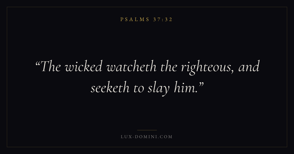 Books / Psalms / Chapter 37 / Verse 32 ← Psalms 37:31 Psalms 37:32 Psalms 37:33 → The wicked watcheth the righteous, and seeketh to slay him. Download verse card Share on Twitter Share on Facebook Pin it ✦ Key themes FaithPrayerPraiseLament Read with Hebrews 11:1Romans 10:17Matthew 6:9Luke 18:1 Related topics Bible verses about faithBible verses about prayerBible verses about thankfulness and gratitudeBible verses about grief and loss ✦ Psalms Chapter 37 verses V. 1 V. 2 V. 3 V. 4 V. 5 V. 6 V. 7 V. 8 V. 9 V. 10 V. 11 V. 12 V. 13 V. 14 V. 15 V. 16 V. 17 V. 18 V. 19 V. 20 V. 21 V. 22 V. 23 V. 24 V. 25 V. 26 V. 27 V. 28 V. 29 V. 30 V. 31 V. 32 V. 33 V. 34 V. 35 V. 36 V. 37 V. 38 V. 39 V. 40