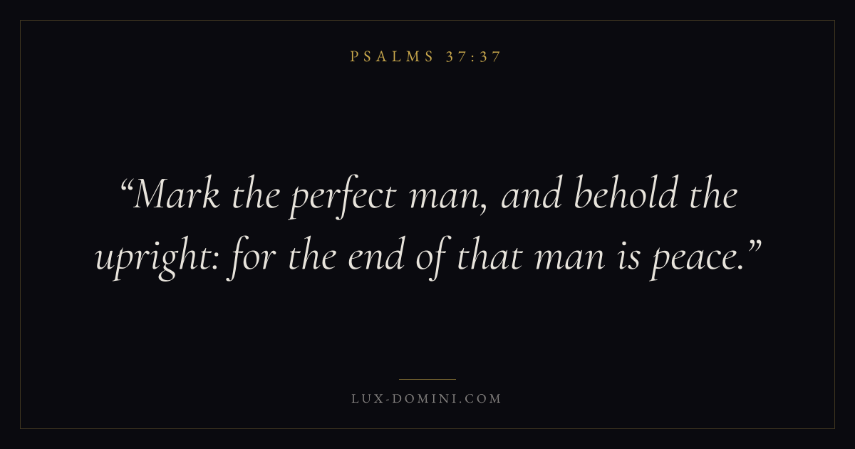 Books / Psalms / Chapter 37 / Verse 37 ← Psalms 37:36 Psalms 37:37 Psalms 37:38 → Mark the perfect man, and behold the upright: for the end of that man is peace. Download verse card Share on Twitter Share on Facebook Pin it ✦ Key themes FaithPrayerPeacePraise Read with Hebrews 11:1Romans 10:17Matthew 6:9Luke 18:1 Related topics Bible verses about faithBible verses about prayerBible verses about peaceBible verses about thankfulness and gratitude ✦ Psalms Chapter 37 verses V. 1 V. 2 V. 3 V. 4 V. 5 V. 6 V. 7 V. 8 V. 9 V. 10 V. 11 V. 12 V. 13 V. 14 V. 15 V. 16 V. 17 V. 18 V. 19 V. 20 V. 21 V. 22 V. 23 V. 24 V. 25 V. 26 V. 27 V. 28 V. 29 V. 30 V. 31 V. 32 V. 33 V. 34 V. 35 V. 36 V. 37 V. 38 V. 39 V. 40