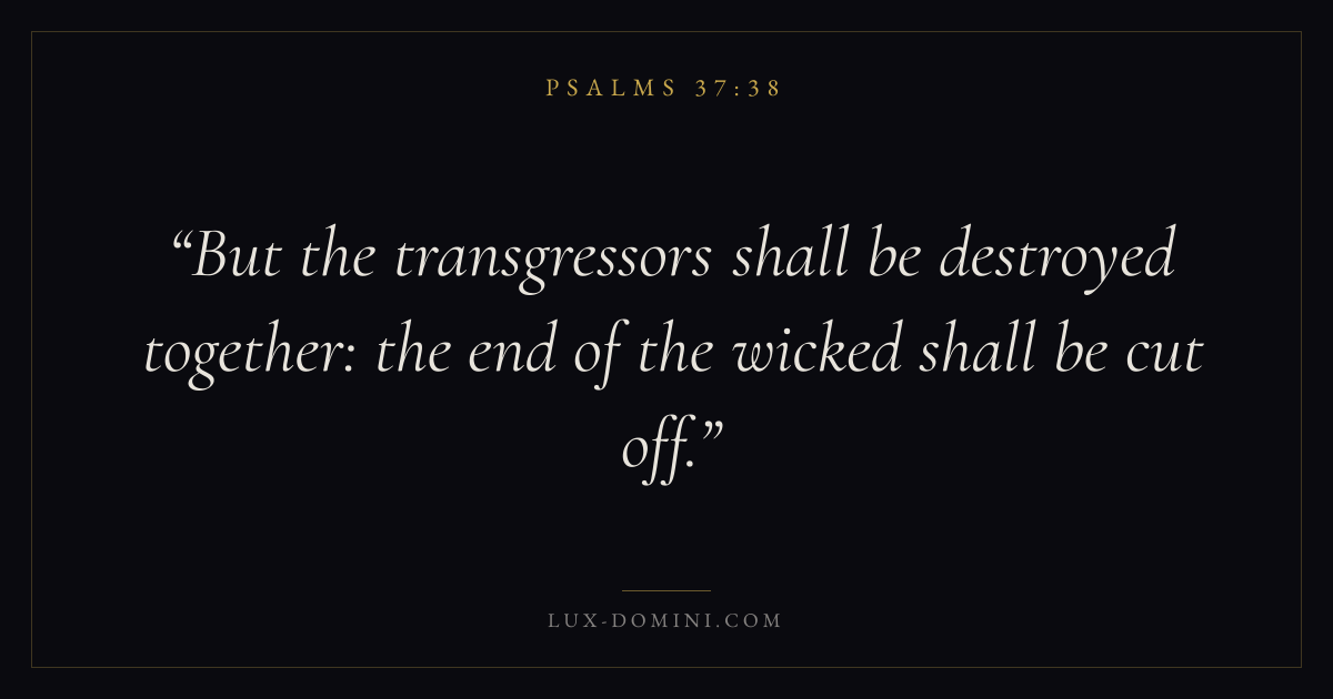 Books / Psalms / Chapter 37 / Verse 38 ← Psalms 37:37 Psalms 37:38 Psalms 37:39 → But the transgressors shall be destroyed together: the end of the wicked shall be cut off. Download verse card Share on Twitter Share on Facebook Pin it ✦ Key themes FaithPrayerPraiseLament Read with Hebrews 11:1Romans 10:17Matthew 6:9Luke 18:1 Related topics Bible verses about faithBible verses about prayerBible verses about thankfulness and gratitudeBible verses about grief and loss ✦ Psalms Chapter 37 verses V. 1 V. 2 V. 3 V. 4 V. 5 V. 6 V. 7 V. 8 V. 9 V. 10 V. 11 V. 12 V. 13 V. 14 V. 15 V. 16 V. 17 V. 18 V. 19 V. 20 V. 21 V. 22 V. 23 V. 24 V. 25 V. 26 V. 27 V. 28 V. 29 V. 30 V. 31 V. 32 V. 33 V. 34 V. 35 V. 36 V. 37 V. 38 V. 39 V. 40