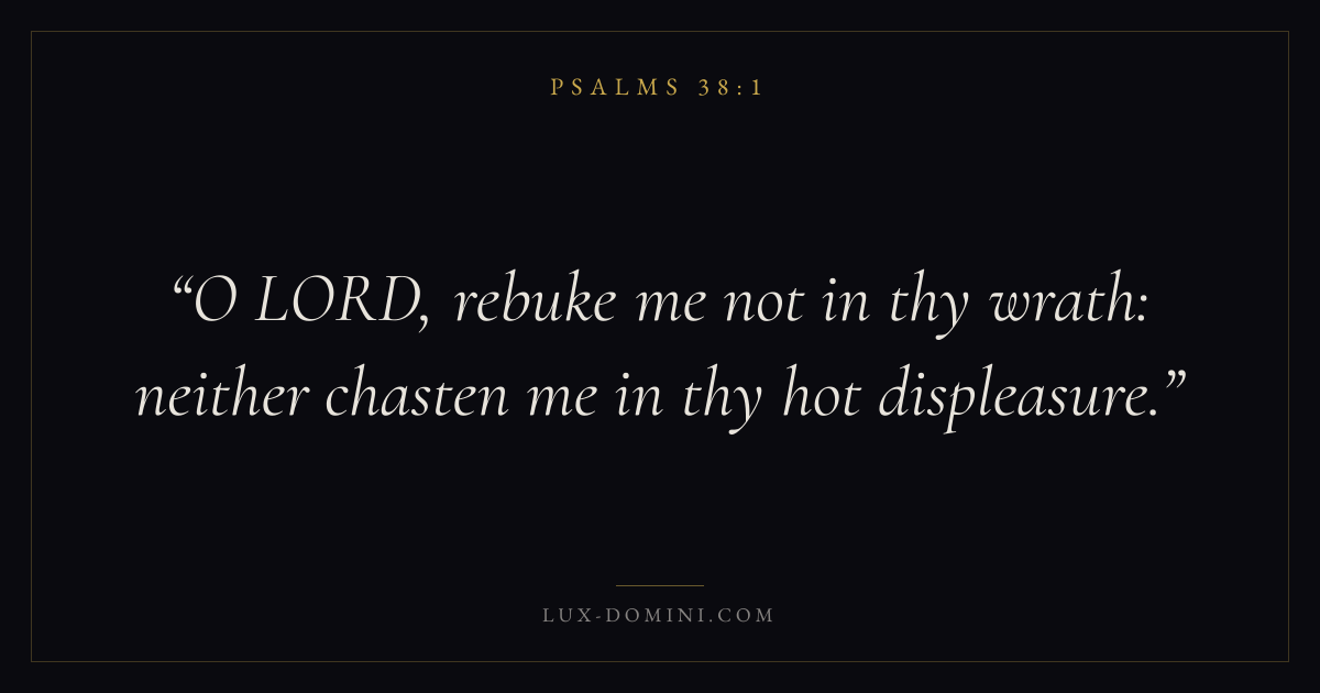 Books / Psalms / Chapter 38 / Verse 1 ← Psalms 37:40 Psalms 38:1 Psalms 38:2 → O LORD, rebuke me not in thy wrath: neither chasten me in thy hot displeasure. Download verse card Share on Twitter Share on Facebook Pin it ✦ Key themes LoveFaithPrayerPraise Read with John 3:161 Corinthians 13:4Hebrews 11:1Romans 10:17 Related topics Bible verses about loveBible verses about faithBible verses about prayerBible verses about thankfulness and gratitude ✦ Psalms Chapter 38 verses V. 1 V. 2 V. 3 V. 4 V. 5 V. 6 V. 7 V. 8 V. 9 V. 10 V. 11 V. 12 V. 13 V. 14 V. 15 V. 16 V. 17 V. 18 V. 19 V. 20 V. 21 V. 22