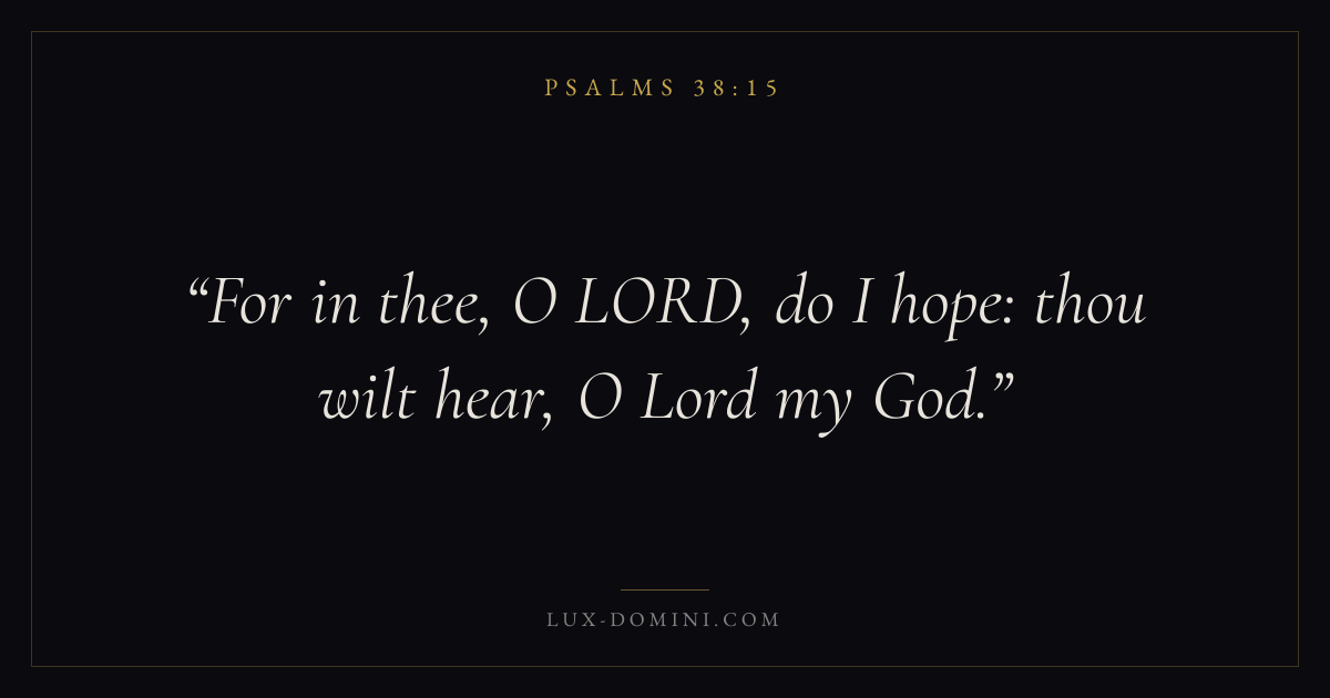 Books / Psalms / Chapter 38 / Verse 15 ← Psalms 38:14 Psalms 38:15 Psalms 38:16 → For in thee, O LORD, do I hope: thou wilt hear, O Lord my God. Download verse card Share on Twitter Share on Facebook Pin it ✦ Key themes FaithHopePrayerPraise Read with Hebrews 11:1Romans 10:17Romans 8:24Revelation 21:4 Related topics Bible verses about faithBible verses about hopeBible verses about prayerBible verses about thankfulness and gratitude ✦ Psalms Chapter 38 verses V. 1 V. 2 V. 3 V. 4 V. 5 V. 6 V. 7 V. 8 V. 9 V. 10 V. 11 V. 12 V. 13 V. 14 V. 15 V. 16 V. 17 V. 18 V. 19 V. 20 V. 21 V. 22