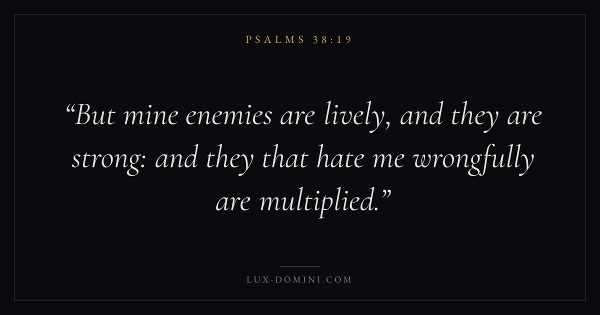 Books / Psalms / Chapter 38 / Verse 19 ← Psalms 38:18 Psalms 38:19 Psalms 38:20 → But mine enemies are lively, and they are strong: and they that hate me wrongfully are multiplied. Download verse card Share on Twitter Share on Facebook Pin it ✦ Key themes FaithPrayerPraiseLament Read with Hebrews 11:1Romans 10:17Matthew 6:9Luke 18:1 Related topics Bible verses about faithBible verses about prayerBible verses about thankfulness and gratitudeBible verses about grief and loss ✦ Psalms Chapter 38 verses V. 1 V. 2 V. 3 V. 4 V. 5 V. 6 V. 7 V. 8 V. 9 V. 10 V. 11 V. 12 V. 13 V. 14 V. 15 V. 16 V. 17 V. 18 V. 19 V. 20 V. 21 V. 22