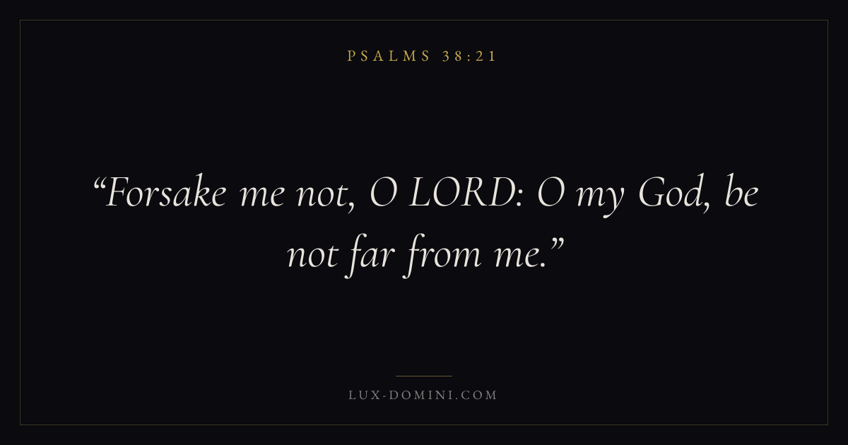 Books / Psalms / Chapter 38 / Verse 21 ← Psalms 38:20 Psalms 38:21 Psalms 38:22 → Forsake me not, O LORD: O my God, be not far from me. Download verse card Share on Twitter Share on Facebook Pin it ✦ Key themes FaithPrayerPraiseLament Read with Hebrews 11:1Romans 10:17Matthew 6:9Luke 18:1 Related topics Bible verses about faithBible verses about prayerBible verses about thankfulness and gratitudeBible verses about grief and loss ✦ Psalms Chapter 38 verses V. 1 V. 2 V. 3 V. 4 V. 5 V. 6 V. 7 V. 8 V. 9 V. 10 V. 11 V. 12 V. 13 V. 14 V. 15 V. 16 V. 17 V. 18 V. 19 V. 20 V. 21 V. 22
