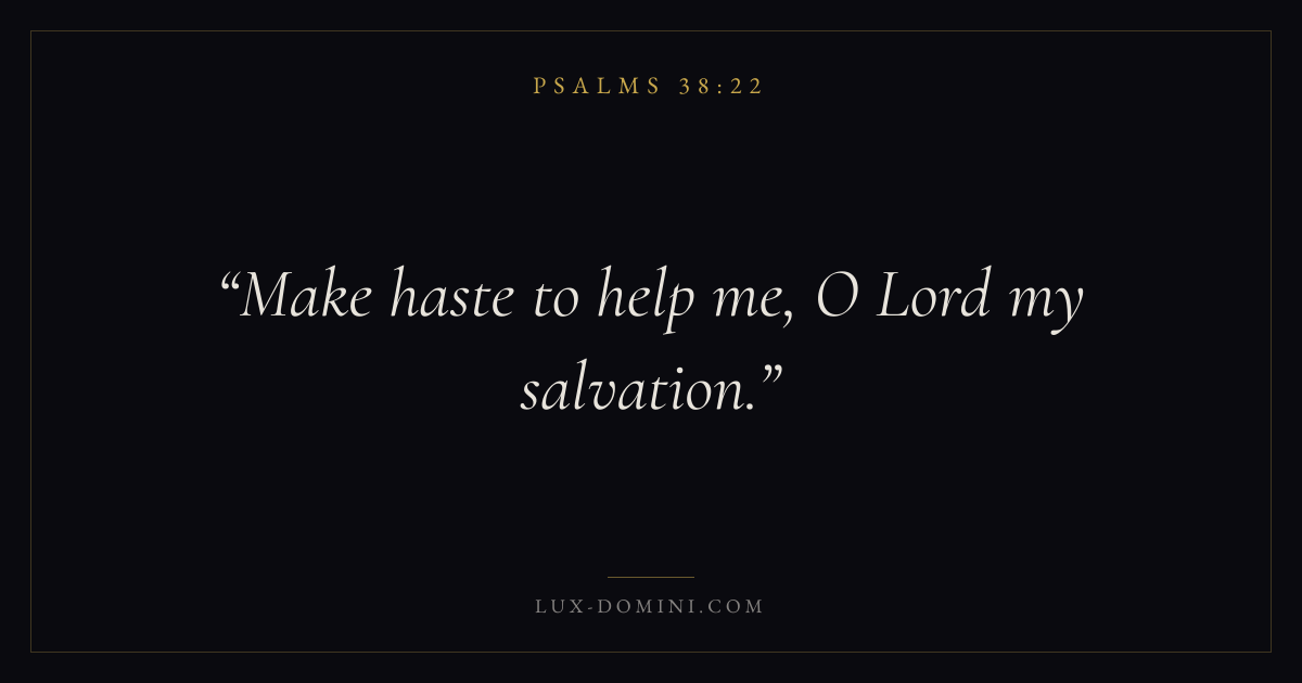 Books / Psalms / Chapter 38 / Verse 22 ← Psalms 38:21 Psalms 38:22 Psalms 39:1 → Make haste to help me, O Lord my salvation. Download verse card Share on Twitter Share on Facebook Pin it ✦ Key themes FaithPrayerSalvationPraise Read with Hebrews 11:1Romans 10:17Matthew 6:9Luke 18:1 Related topics Bible verses about faithBible verses about prayerBible verses about salvationBible verses about thankfulness and gratitude ✦ Psalms Chapter 38 verses V. 1 V. 2 V. 3 V. 4 V. 5 V. 6 V. 7 V. 8 V. 9 V. 10 V. 11 V. 12 V. 13 V. 14 V. 15 V. 16 V. 17 V. 18 V. 19 V. 20 V. 21 V. 22