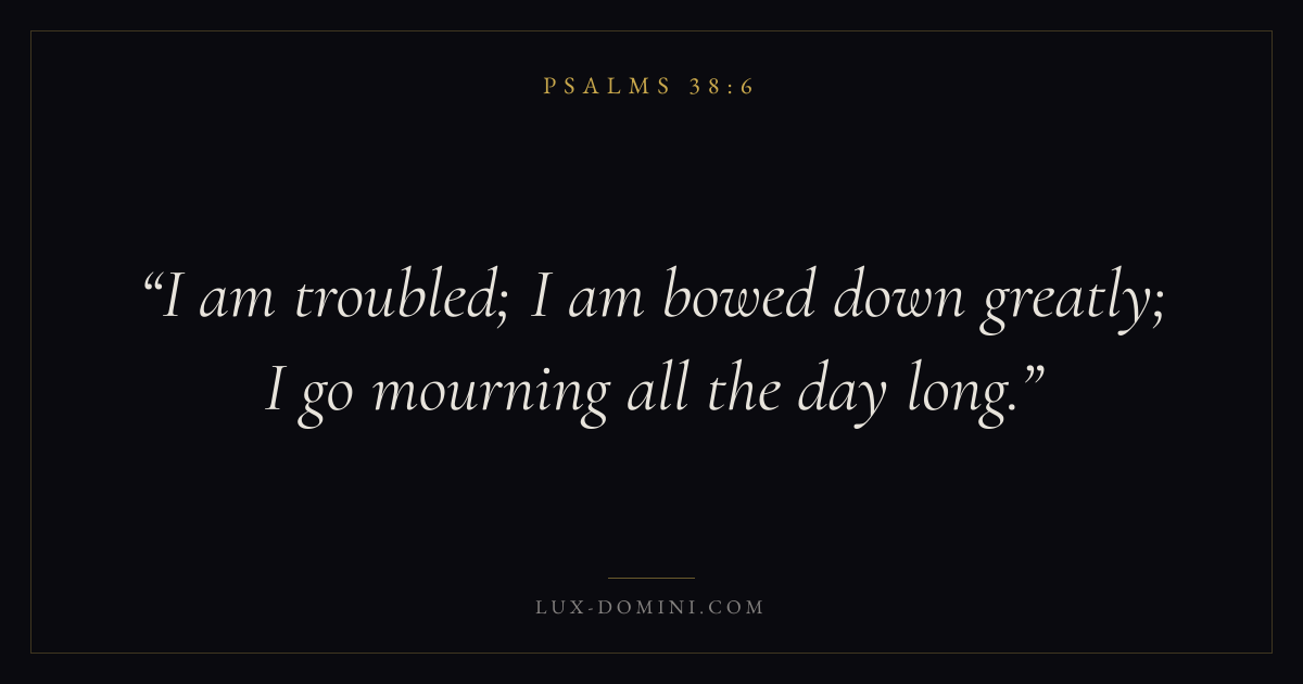 Books / Psalms / Chapter 38 / Verse 6 ← Psalms 38:5 Psalms 38:6 Psalms 38:7 → I am troubled; I am bowed down greatly; I go mourning all the day long. Download verse card Share on Twitter Share on Facebook Pin it ✦ Key themes LoveFaithAnxiety and fearPrayerPraise Read with John 3:161 Corinthians 13:4Hebrews 11:1Romans 10:17 Related topics Bible verses about loveBible verses about faithBible verses about anxiety and fearBible verses about prayerBible verses about thankfulness and gratitude ✦ Psalms Chapter 38 verses V. 1 V. 2 V. 3 V. 4 V. 5 V. 6 V. 7 V. 8 V. 9 V. 10 V. 11 V. 12 V. 13 V. 14 V. 15 V. 16 V. 17 V. 18 V. 19 V. 20 V. 21 V. 22
