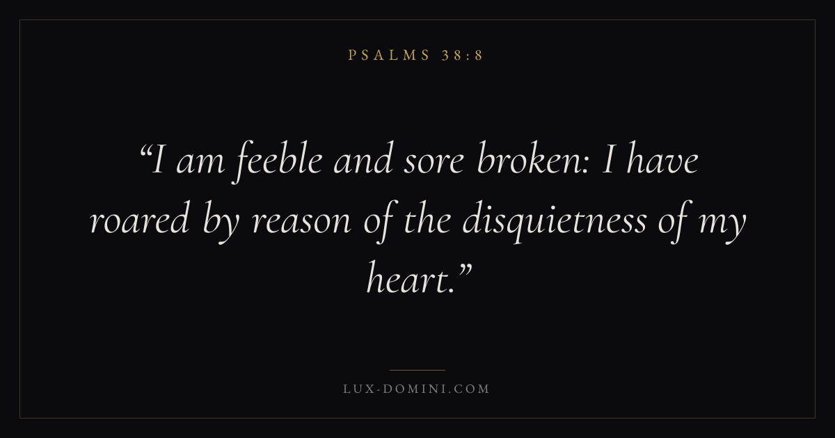 Books / Psalms / Chapter 38 / Verse 8 ← Psalms 38:7 Psalms 38:8 Psalms 38:9 → I am feeble and sore broken: I have roared by reason of the disquietness of my heart. Download verse card Share on Twitter Share on Facebook Pin it ✦ Key themes LoveFaithPrayerPraise Read with John 3:161 Corinthians 13:4Hebrews 11:1Romans 10:17 Related topics Bible verses about loveBible verses about faithBible verses about prayerBible verses about thankfulness and gratitude ✦ Psalms Chapter 38 verses V. 1 V. 2 V. 3 V. 4 V. 5 V. 6 V. 7 V. 8 V. 9 V. 10 V. 11 V. 12 V. 13 V. 14 V. 15 V. 16 V. 17 V. 18 V. 19 V. 20 V. 21 V. 22