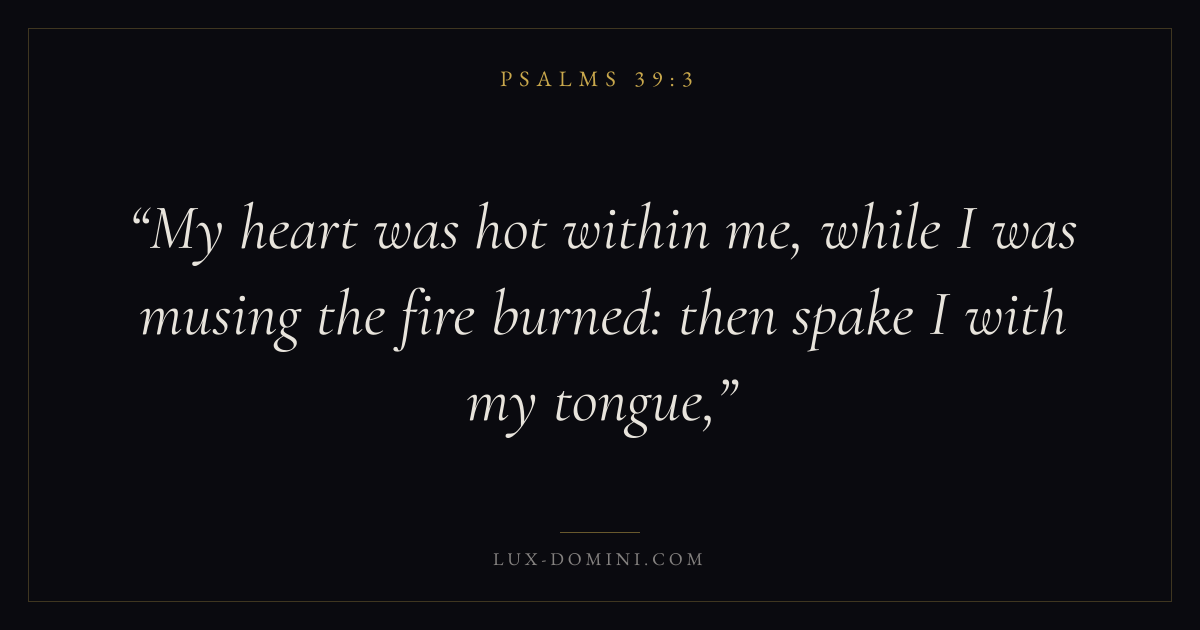 Books / Psalms / Chapter 39 / Verse 3 ← Psalms 39:2 Psalms 39:3 Psalms 39:4 → My heart was hot within me, while I was musing the fire burned: then spake I with my tongue, Download verse card Share on Twitter Share on Facebook Pin it ✦ Key themes FaithPrayerPraiseLament Read with Hebrews 11:1Romans 10:17Matthew 6:9Luke 18:1 Related topics Bible verses about faithBible verses about prayerBible verses about thankfulness and gratitudeBible verses about grief and loss ✦ Psalms Chapter 39 verses V. 1 V. 2 V. 3 V. 4 V. 5 V. 6 V. 7 V. 8 V. 9 V. 10 V. 11 V. 12 V. 13