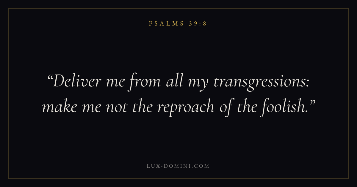 Books / Psalms / Chapter 39 / Verse 8 ← Psalms 39:7 Psalms 39:8 Psalms 39:9 → Deliver me from all my transgressions: make me not the reproach of the foolish. Download verse card Share on Twitter Share on Facebook Pin it ✦ Key themes FaithPrayerPraiseLament Read with Hebrews 11:1Romans 10:17Matthew 6:9Luke 18:1 Related topics Bible verses about faithBible verses about prayerBible verses about thankfulness and gratitudeBible verses about grief and loss ✦ Psalms Chapter 39 verses V. 1 V. 2 V. 3 V. 4 V. 5 V. 6 V. 7 V. 8 V. 9 V. 10 V. 11 V. 12 V. 13