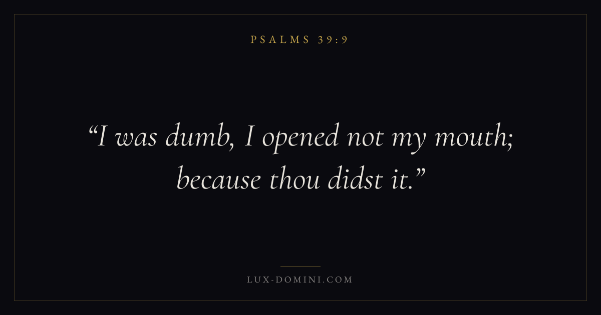 Books / Psalms / Chapter 39 / Verse 9 ← Psalms 39:8 Psalms 39:9 Psalms 39:10 → I was dumb, I opened not my mouth; because thou didst it. Download verse card Share on Twitter Share on Facebook Pin it ✦ Key themes FaithPrayerPraiseLament Read with Hebrews 11:1Romans 10:17Matthew 6:9Luke 18:1 Related topics Bible verses about faithBible verses about prayerBible verses about thankfulness and gratitudeBible verses about grief and loss ✦ Psalms Chapter 39 verses V. 1 V. 2 V. 3 V. 4 V. 5 V. 6 V. 7 V. 8 V. 9 V. 10 V. 11 V. 12 V. 13