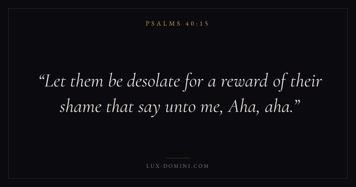 Books / Psalms / Chapter 40 / Verse 15 ← Psalms 40:14 Psalms 40:15 Psalms 40:16 → Let them be desolate for a reward of their shame that say unto me, Aha, aha. Download verse card Share on Twitter Share on Facebook Pin it ✦ Key themes FaithPrayerGracePraise Read with Hebrews 11:1Romans 10:17Matthew 6:9Luke 18:1 Related topics Bible verses about faithBible verses about prayerBible verses about graceBible verses about thankfulness and gratitude ✦ Psalms Chapter 40 verses V. 1 V. 2 V. 3 V. 4 V. 5 V. 6 V. 7 V. 8 V. 9 V. 10 V. 11 V. 12 V. 13 V. 14 V. 15 V. 16 V. 17