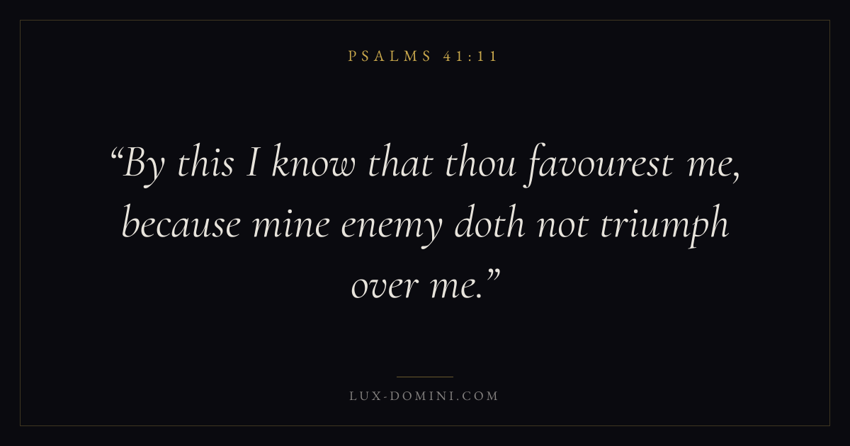 Books / Psalms / Chapter 41 / Verse 11 ← Psalms 41:10 Psalms 41:11 Psalms 41:12 → By this I know that thou favourest me, because mine enemy doth not triumph over me. Download verse card Share on Twitter Share on Facebook Pin it ✦ Key themes FaithPrayerTruthPraise Read with Hebrews 11:1Romans 10:17Matthew 6:9Luke 18:1 Related topics Bible verses about faithBible verses about prayerBible verses about truthBible verses about thankfulness and gratitude ✦ Psalms Chapter 41 verses V. 1 V. 2 V. 3 V. 4 V. 5 V. 6 V. 7 V. 8 V. 9 V. 10 V. 11 V. 12 V. 13