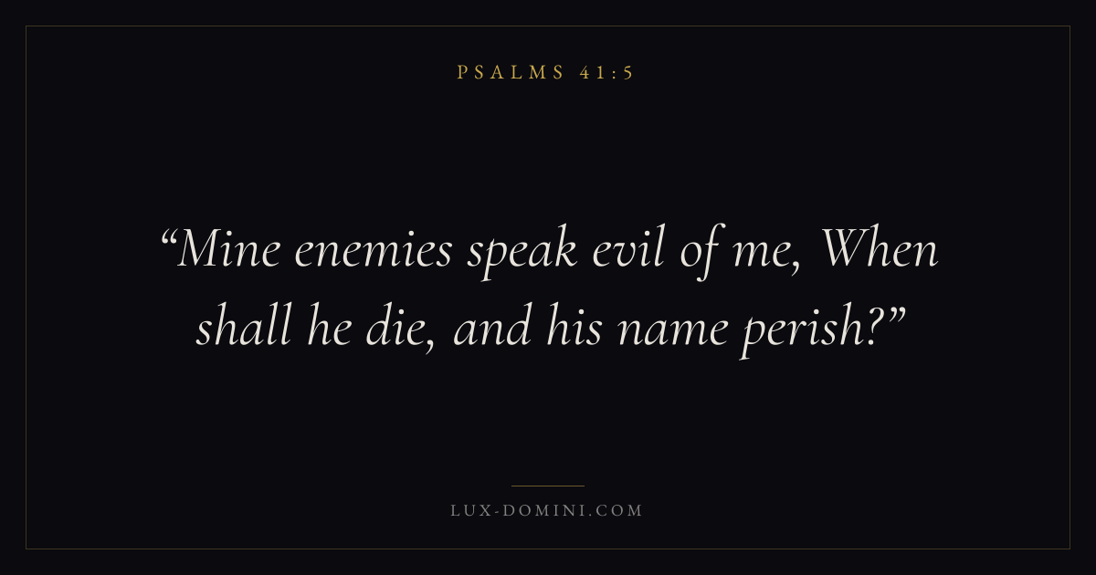 Books / Psalms / Chapter 41 / Verse 5 ← Psalms 41:4 Psalms 41:5 Psalms 41:6 → Mine enemies speak evil of me, When shall he die, and his name perish? Download verse card Share on Twitter Share on Facebook Pin it ✦ Key themes FaithPrayerTruthPraise Read with Hebrews 11:1Romans 10:17Matthew 6:9Luke 18:1 Related topics Bible verses about faithBible verses about prayerBible verses about truthBible verses about thankfulness and gratitude ✦ Psalms Chapter 41 verses V. 1 V. 2 V. 3 V. 4 V. 5 V. 6 V. 7 V. 8 V. 9 V. 10 V. 11 V. 12 V. 13