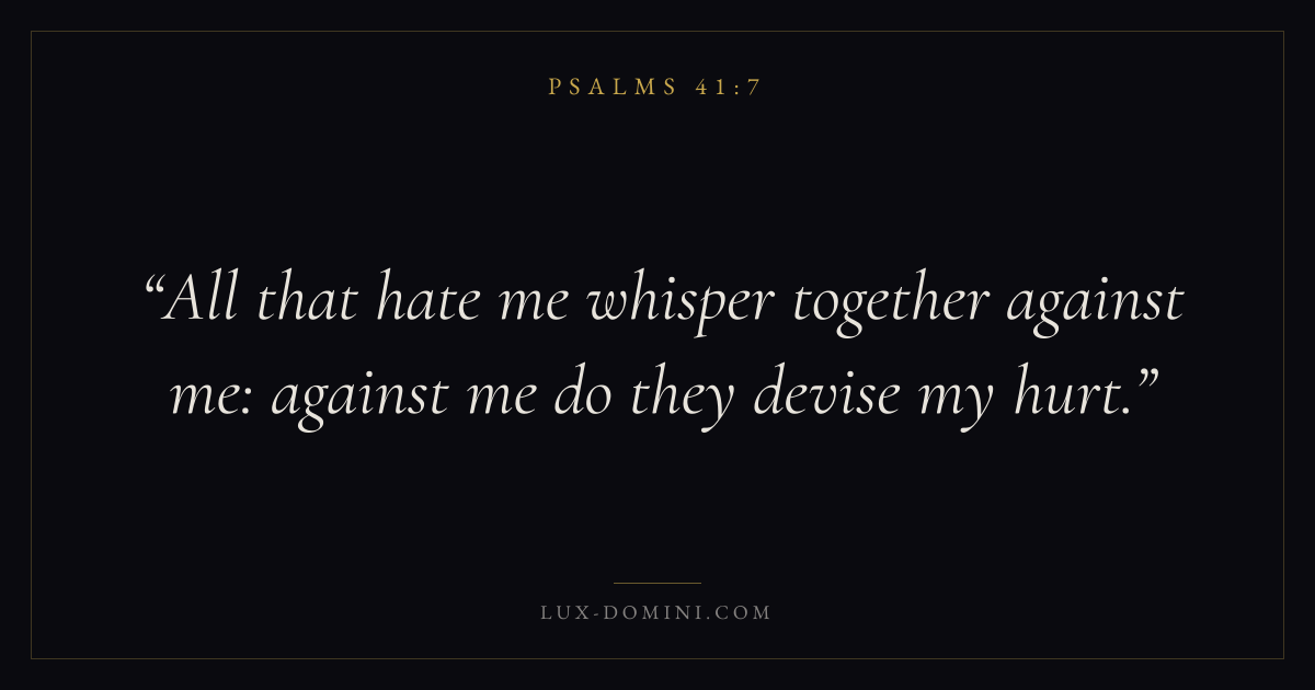 Books / Psalms / Chapter 41 / Verse 7 ← Psalms 41:6 Psalms 41:7 Psalms 41:8 → All that hate me whisper together against me: against me do they devise my hurt. Download verse card Share on Twitter Share on Facebook Pin it ✦ Key themes FaithPrayerTruthPraise Read with Hebrews 11:1Romans 10:17Matthew 6:9Luke 18:1 Related topics Bible verses about faithBible verses about prayerBible verses about truthBible verses about thankfulness and gratitude ✦ Psalms Chapter 41 verses V. 1 V. 2 V. 3 V. 4 V. 5 V. 6 V. 7 V. 8 V. 9 V. 10 V. 11 V. 12 V. 13