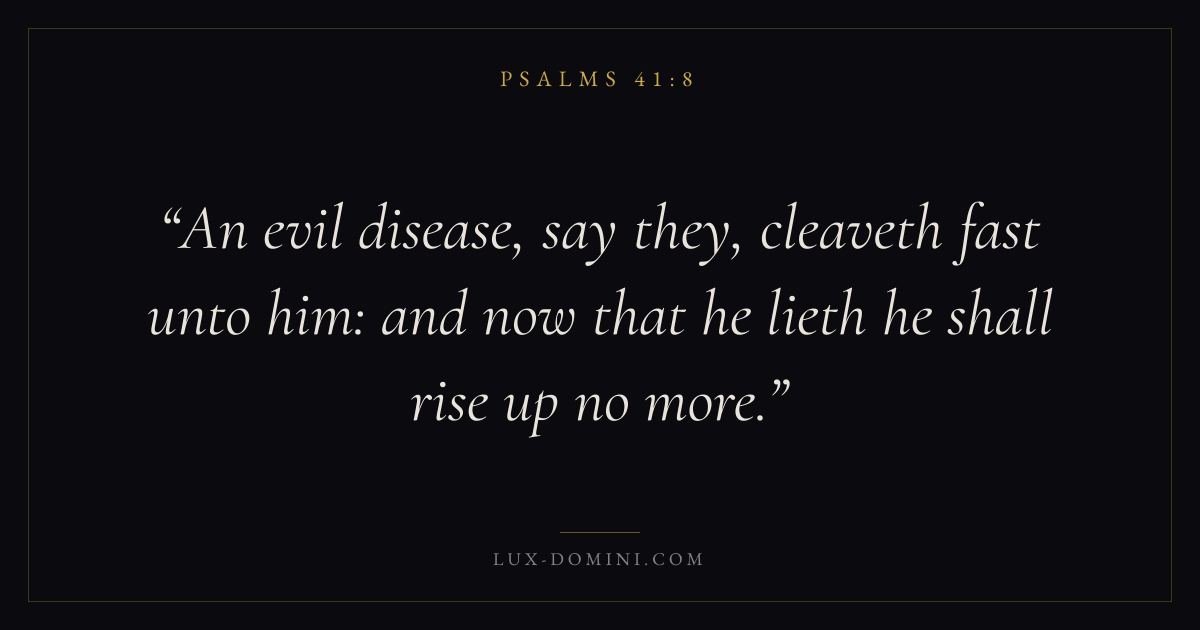 Books / Psalms / Chapter 41 / Verse 8 ← Psalms 41:7 Psalms 41:8 Psalms 41:9 → An evil disease, say they, cleaveth fast unto him: and now that he lieth he shall rise up no more. Download verse card Share on Twitter Share on Facebook Pin it ✦ Key themes FaithPrayerTruthPraise Read with Hebrews 11:1Romans 10:17Matthew 6:9Luke 18:1 Related topics Bible verses about faithBible verses about prayerBible verses about truthBible verses about thankfulness and gratitude ✦ Psalms Chapter 41 verses V. 1 V. 2 V. 3 V. 4 V. 5 V. 6 V. 7 V. 8 V. 9 V. 10 V. 11 V. 12 V. 13