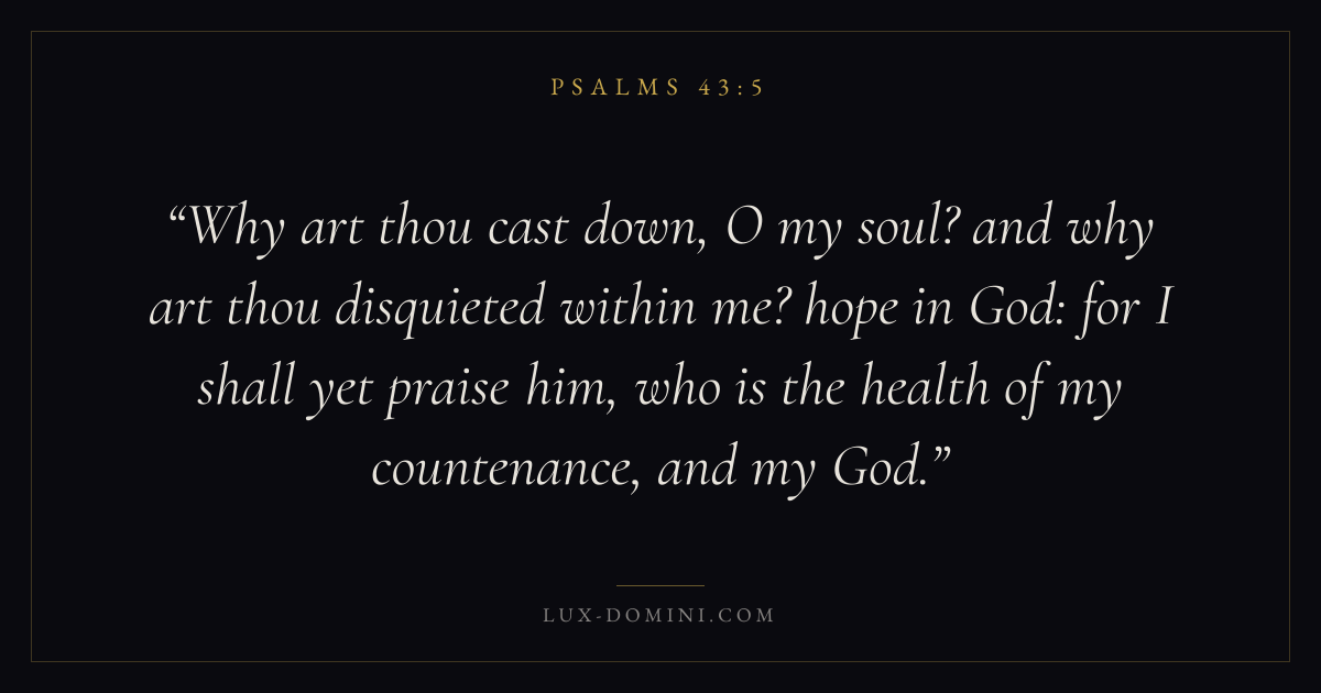 Why art thou cast down, O my soul? and why art thou disquieted within me? hope in God: for I shall yet praise him, who is the health of my countenance, and my God.