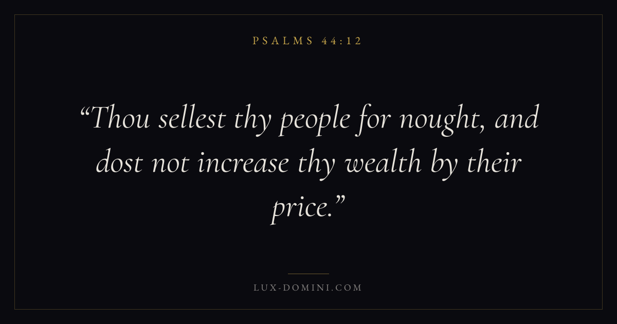 Books / Psalms / Chapter 44 / Verse 12 ← Psalms 44:11 Psalms 44:12 Psalms 44:13 → Thou sellest thy people for nought, and dost not increase thy wealth by their price. Download verse card Share on Twitter Share on Facebook Pin it ✦ Key themes FaithAnxiety and fearSuffering and trialsPrayerPraise Read with Hebrews 11:1Romans 10:17Philippians 4:6Isaiah 41:10 Related topics Bible verses about faithBible verses about anxiety and fearBible verses about suffering and trialsBible verses about prayerBible verses about thankfulness and gratitude ✦ Psalms Chapter 44 verses V. 1 V. 2 V. 3 V. 4 V. 5 V. 6 V. 7 V. 8 V. 9 V. 10 V. 11 V. 12 V. 13 V. 14 V. 15 V. 16 V. 17 V. 18 V. 19 V. 20 V. 21 V. 22 V. 23 V. 24 V. 25 V. 26